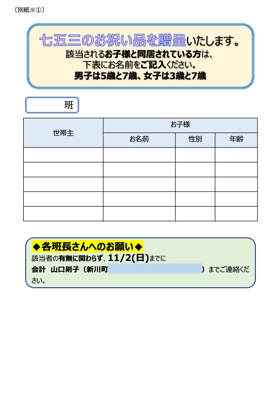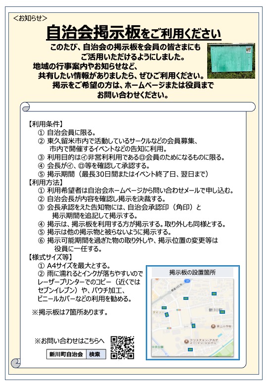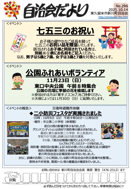 自治会だより2025.10.15 七五三祝&公園ふれあいボランティア案内&防災フェスタ報告 11/23(日)に公園ふれあいボランティア(花壇の花植え)を開催します。ご参加ください。 新川町自治会の掲示板は町内に7か所あります。自治会役員会にて利用条件や利用方法を取り決めましたので、必要に応じてご利用申し込みください。 七五三について。自治会員は10/15発信の紙の回覧版にてご確認お願いします。 2025.10.15 七五三祝い&11/23公園ふれあいボランティア案内&二小防災フェスタ報告(PDF)
