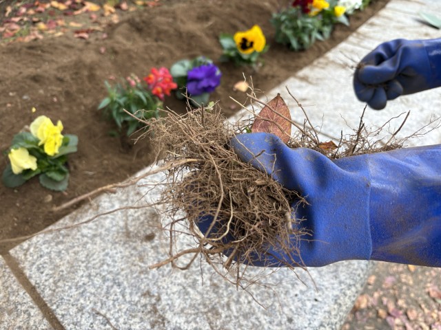 そのあと、スコップで花壇へ溝を掘る作業を実施。それと、根っこの除去を同時進行で行いました。これがタイヘン・・・。