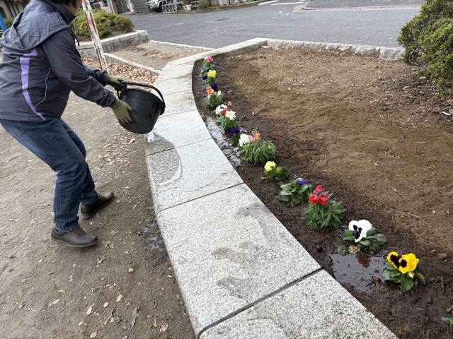 ジョウロやバケツを使って、苗一つひとつにたっぷりと水をあげ、しっかり根付くようにしました。